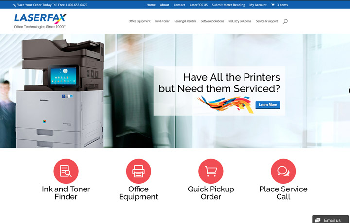 After years without a viable eCommerce system, Laserfax came to us to both develop one that handles their inventory of over 10,000 products, and their in-house manufactured ink and toner for virtually all printers. We also address all of the other technology solutions involved with today’s corporate printers and networks. With content from manufacturers, as well as their own, Laserfax is now competing on a national level with companies 10 times their size.